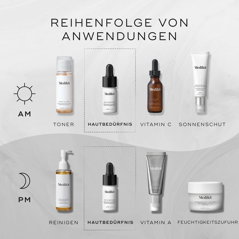 Hellen Sie dunkle Flecken und Verfärbungen in nur 7 Tagen* auf mit Medik8s professionellem Peptidserum. Oxy-R Peptide, die nur bei Medik8 in einer bisher unerreichten Konzentration von 1% Oxyresveratrol erhältlich sind, bieten eine klinisch nachgewiesene Wirkung bei allen Hauttönen und sorgen für eine sichtbar hellere, gleichmäßigere Haut mit weniger dunklen Flecken und Narben nach Unreinheiten. Anders als anderen Produkte sorgt das patentierte, klick-aktivierte Stabilisierungssystem von Medik8 für eine unübertroffene Peptidpotenz für tiefgreifende, sichtbare Ergebnisse - vom ersten bis zum letzten Tropfen.