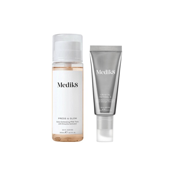 The Medik8 Press & Glow Daily Exfoliating PHA Tonic is a hydrating acid toner that helps to exfoliate the surface of the complexion for noticeable everyday glow, while the Medik8 Crystal Retinal 6 Night Serum is formulated with 0.06% stabilised retinal, a powerful derivative of vitamin A with next-generation anti-ageing results that visibly minimizes fine lines and wrinkles, firming and plumping the complexion to resurface skin texture and soften the face.