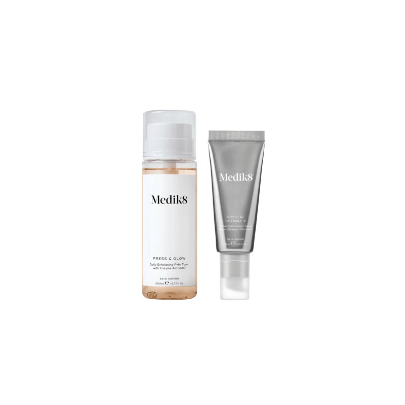The Medik8 Press & Glow and Crystal Retinal 6 Bundle is a powerful skincare duo that helps to exfoliate, hydrate, and resurface the skin for a more youthful and radiant complexion.