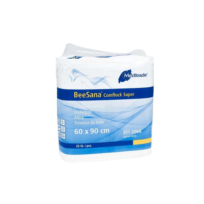 Meditrade BeeSana Comflock super bed pads, 90 x 60 cm. Features: * Patient pads with absorbent body made of cellulose flakes * Fast and full-surface moisture absorption * Dry fleece with non-slip outer film ensures needs-based and efficient use. Application: * Help in home care to increase care comfort * Make daily work easier * Serve as bed protection