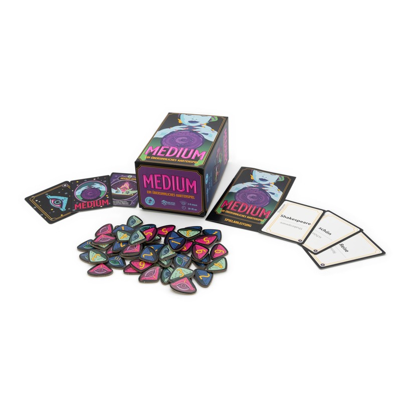 Discover your psychic abilities and telepathic connections to the other players with MEDIUM. In this exciting card game, you try to find the secret connecting word – the medium – that connects your two cards together. How does it work? At the beginning of each round, two players play one card each. The challenge is to find through telepathic communication the one word that links the two cards played together. Speak this word aloud at the same time and prove that you have a mental connection! But that's not all. You have up to three attempts to discover the medium. The faster you find the connection, the more points you get. With each successful attempt, your stack of points grows and brings you closer to victory. Use your intuition and trust in the mental energy that connects you. Game material and special skills: MEDIUM contains a variety of word cards, telepathy tiles and special action cards that can influence the game action. These special skills open up new strategic possibilities and increase the fun factor. Together to victory: As you form a team with a player in every round, MEDIUM challenges your ability to collaborate and communicate. The game ends when the third crystal ball card is pulled and the telepathic connection is interrupted. Then the points are counted and the team with the most points wins. Whether as an exciting family game or in a social round with friends – Medium offers exciting fun for 2-8 players with a playing time of 30-45 minutes. Be ready for a game full of surprises and fun moments!