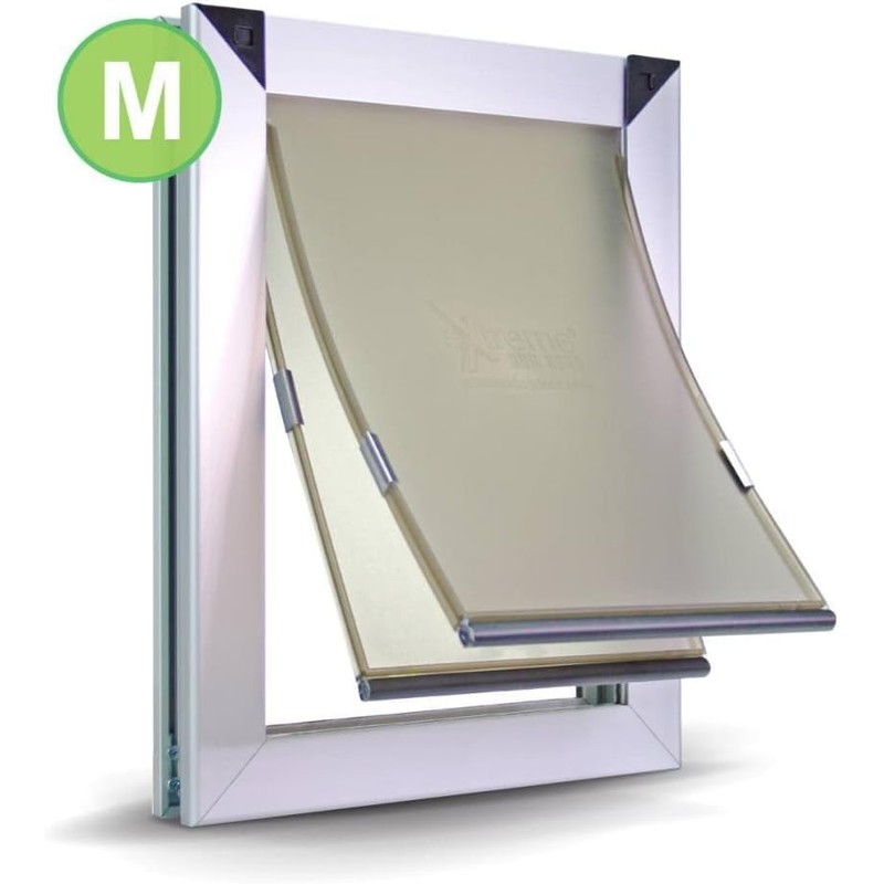 The Extreme Dog Door line of pet doors includes a sturdy, aluminum alloy frame and polyurethane flap(s). The flaps have a magnetic strip to help ensure a tight seal when not being used. This is the ideal rough weather pet door for your dog, because it outperforms even many of the big brand doggie door options.