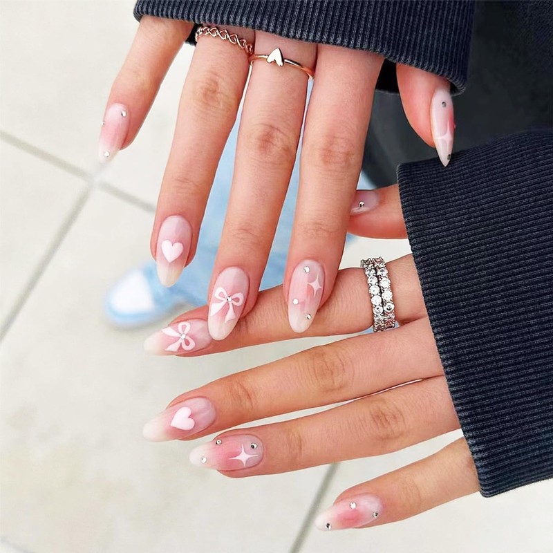 Medium Press on Nails Almond Fake Nails with Gem Design Bow Heart Star False Nails Reusable Glossy Acrylic Nails Full Cover Artificial Stick on Nails Pink Glue on Nails for Women DIY Manicure 24Pcs