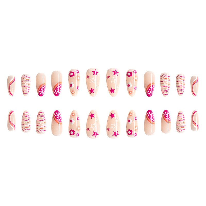 Medium Press on Nails Almond, Flower Fake Nail, Glossy Pink False Nails, Artificial Glue on Nails, Spring Colorful Flower Stripes Almond Nails, Irregular Bot Medium Nails for Women