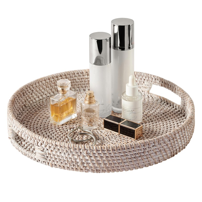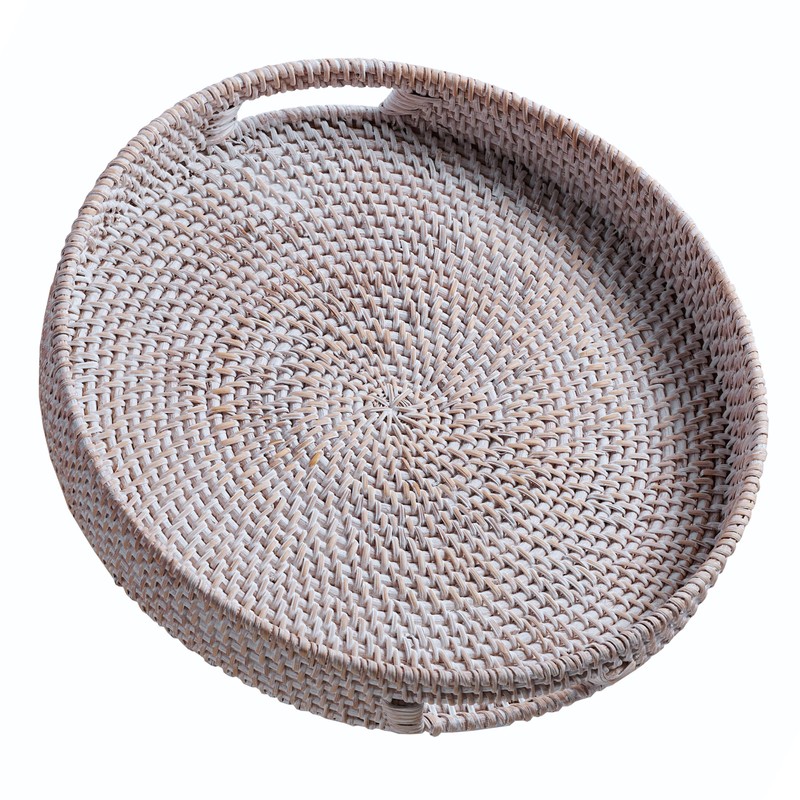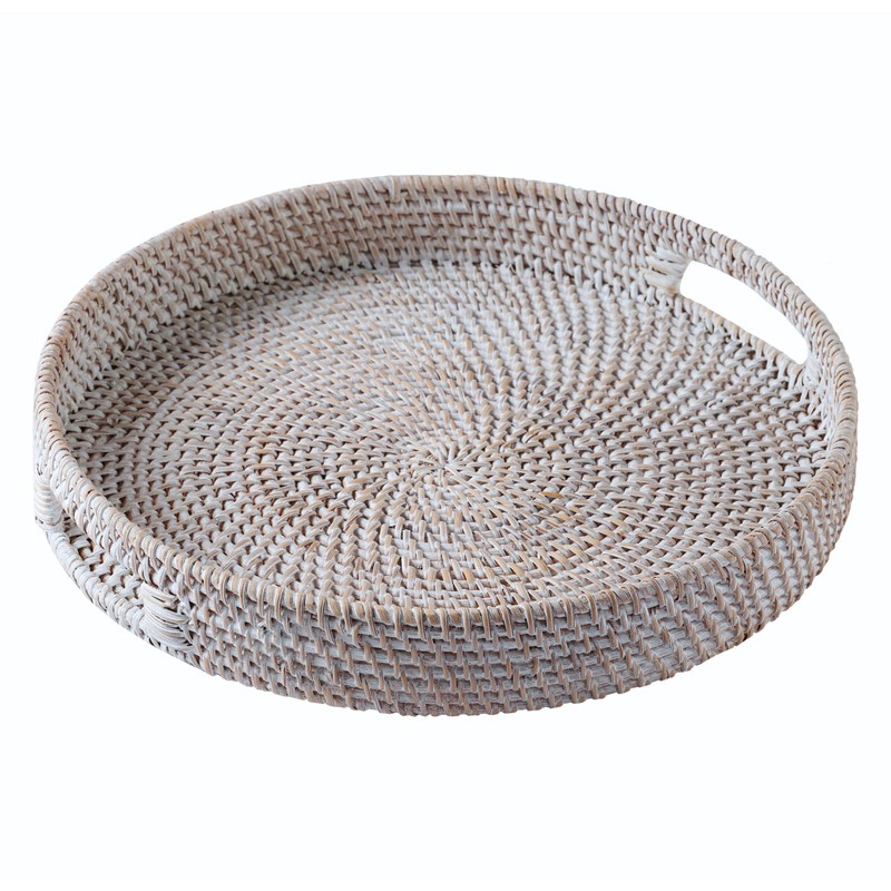 Medium Rattan Serving Tray 12" in Whitewash • Woven Serving Trays with Handles for Home • Round Dining Table Tray • Wicker Serving Basket
