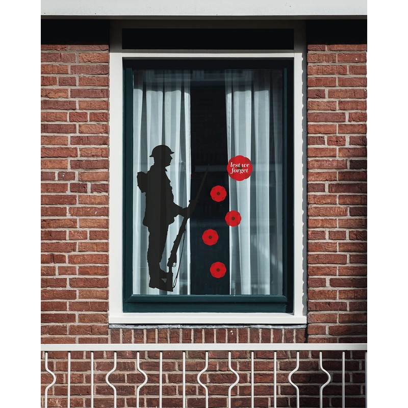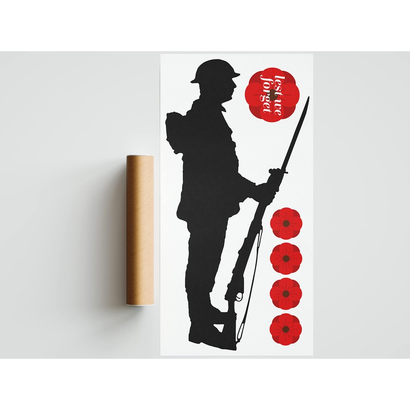 - Soldier Silhouette with Poppies – Our medium soldier silhouette window sticker with 5 individual Poppy window stickers is a fitting reminder of our fallen heroes during remembrance period. One Poppy has the Lest We Forget remembrance phrase.