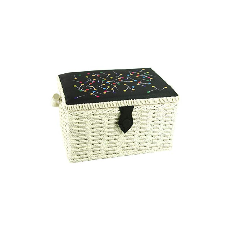 Medium Sewing Box, Wicker Effect with a Multi-coloured Pins Pattern on Black Fabric Lid, 26 x 19 x 15cm