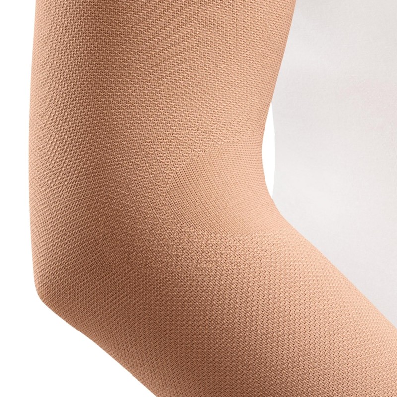 Address lymphedema and upper extremity swelling from primary causes or secondary trauma from surgery and radiation treatment.  Seamless in construction and soft to the touch, this arm sleeve is manufactured with precision using quality materials that help prevent swelling and the progression of lymphedema. This arm sleeve, with double ellipses at the elbow and crease, ensures freedom of movement while offering a custom-like fit. Its anti-slip silicone band at the top keeps it secure and intact in place during activity. This hand support sleeve addresses post-operative and post-traumatic edema, and primary and secondary stage 1 lymphedema of the arm. Its breathable fabric offers excellent wearing comfort. It is latex- and cotton-free and suitable for machine washing and tumble drying at low temperatures.