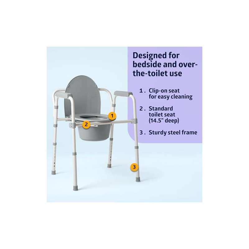 Medline -in- Steel Bedside Commode, Standard Seat, Sturdy Folding Frame, . QT. Bucket, lb. Weight Capacity, Clip-on Seat, Easy Cleaning, Tool-Free Assembly, Gray