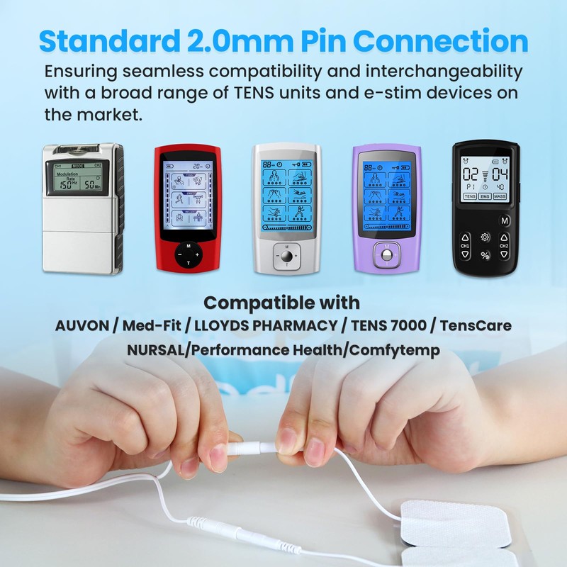 - Wide Compatibility: Feature the industry-standard 2mm-diameter pin-style connection, ensuring compatibility and interchangeability with 99% of the devices we offer. Compatible with TENS units and EMS devices, including popular brands such as TENS 7000, AUVON, Nicwell Care, Neocarbon, Etekcity, NURSAL, TENKER, iSTIM EV-805, Kongzee, Therapist's Choice, Roscoe Medical, Comfytemp, HealthmateForever YK15AB, and iReliev.