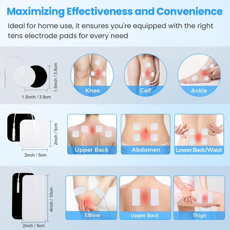 - Package Includes: 8 small round, 16 square, and 8 rectangular TENS unit pads. (Note: No leads/device. Verify pad specs before ordering.) Explore our range to find the perfect size and shape for your needs!