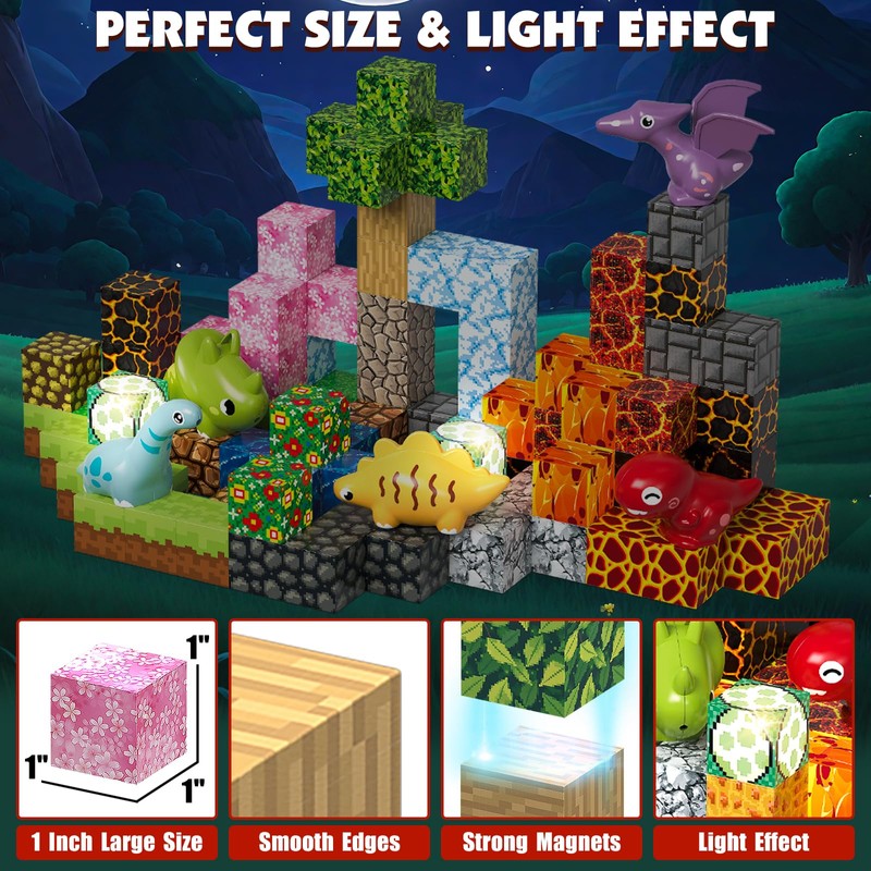 - Upgrade Magnetic Block Set: Includes 5 dinosaur toys, 98 ordinary magnetic blocks and 2 light up magnet blocks. When you open the light switch, the 2 glowing blocks emit a soft light in the dark, adding a touch of mystery and excitement to nighttime play. Kids can learn about different dinosaur species while sparking their imagination for role-playing and storytelling.