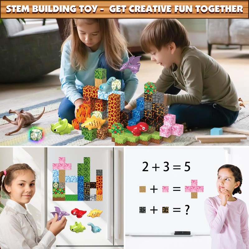 - Perfect Present for Kids: The engaging nature of these dinosaur toys keep kids of all ages entertained and away from screens. Ideal for classrooms and suitable for preschoolers and teenagers aged 3+ on birthdays, Christmas, Children's Day, and themed parties. SIZE: 1x1x1 INCH, 100PCS Magnetic Blocks & 5PCS Magnetic Dinosaurs (Random Color).