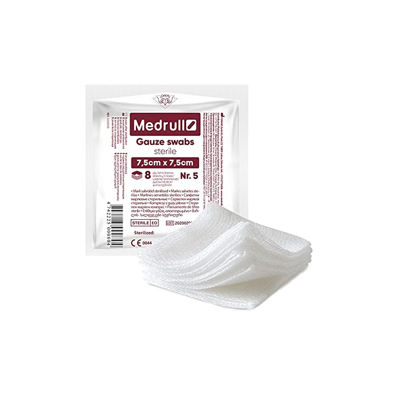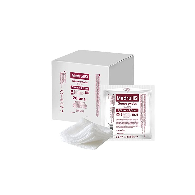 Medrull Mulltupfer Steril 7.5cm x 7.5cm Nicht klebende Wundauflagen 1200 Stück Extra saugfähig -8-lagig - Verpackt 5 Stück x 20 x 12 boxes