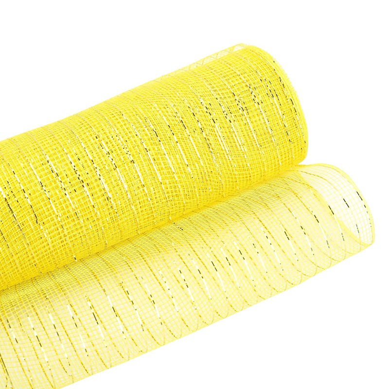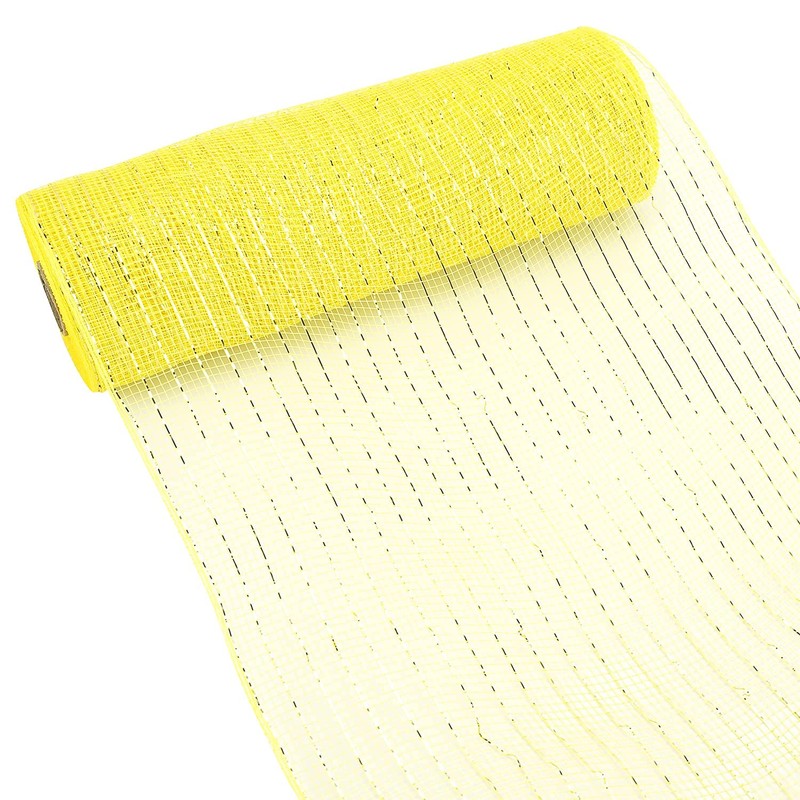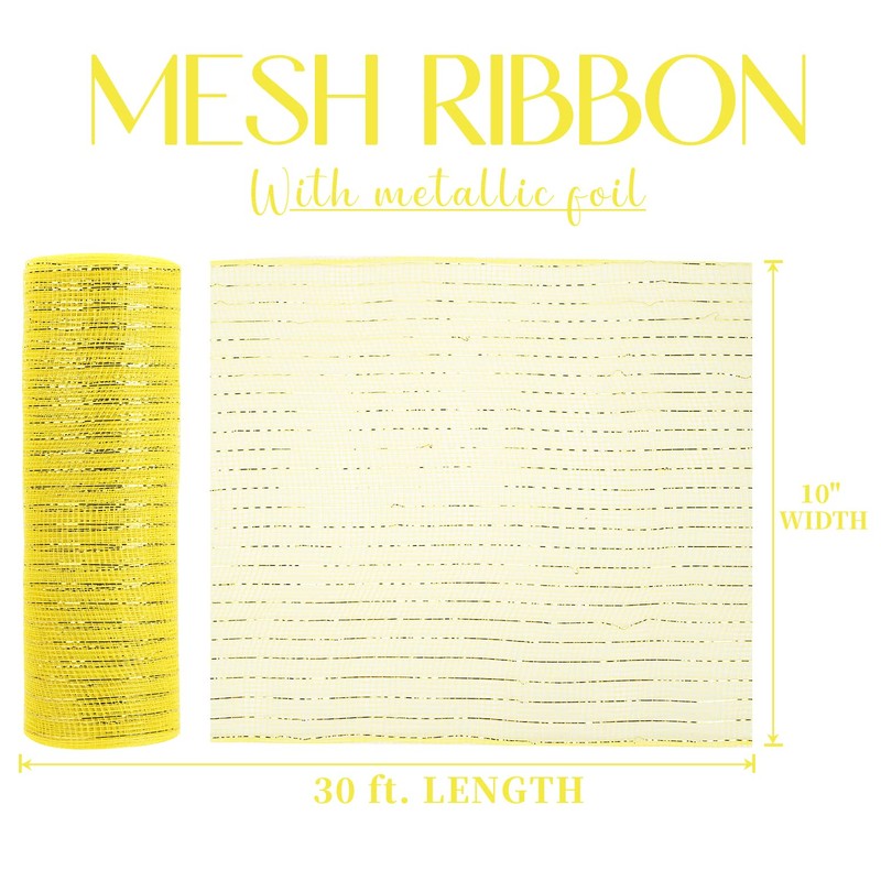 - A 10 inch wide, 10 yards roll of yellow deco mesh ribbon with standard foil. Great texture and sparkle that works for multiple themes. Whether you're making a wreath, a garland, or a bow, the beautifully full ruffles, curls and poofs that you fix into your design will stay that way.