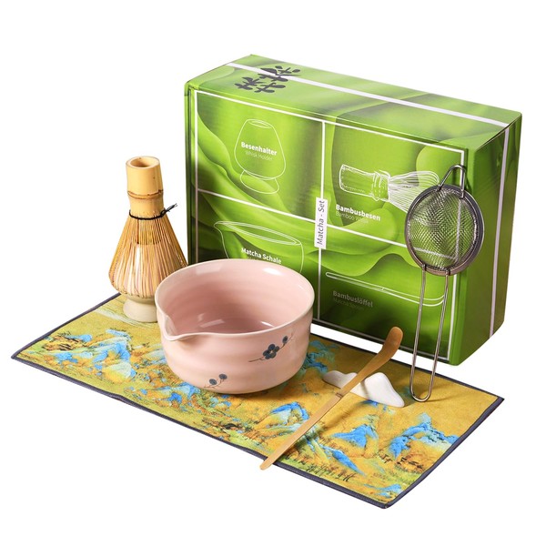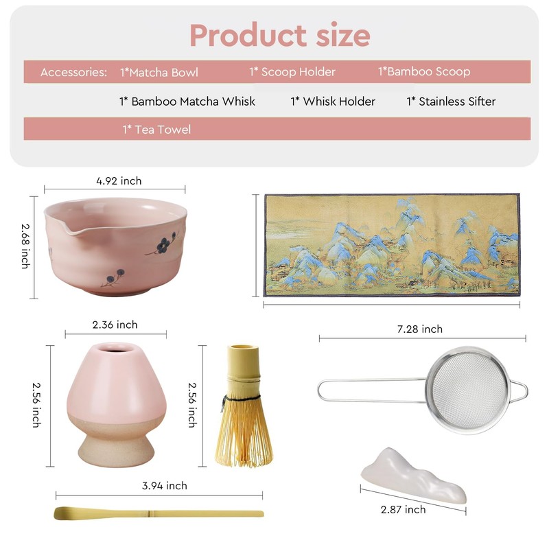 - Matcha Kit: This matcha kit includes essentials for an authentic matcha experience: 1* Bamboo Matcha Whisk, 1* Bamboo Scoop, 1* Scoop Rest, 1* Stainless steel sifter, 1* 500 ml/17 oz Ceramic Matcha Bowl (Chawan), 1* Whisk Holder, 1* Tea Towel . Each tool is crafted with precision, designed to make your matcha lifestyle effortlessly stylish Experience.