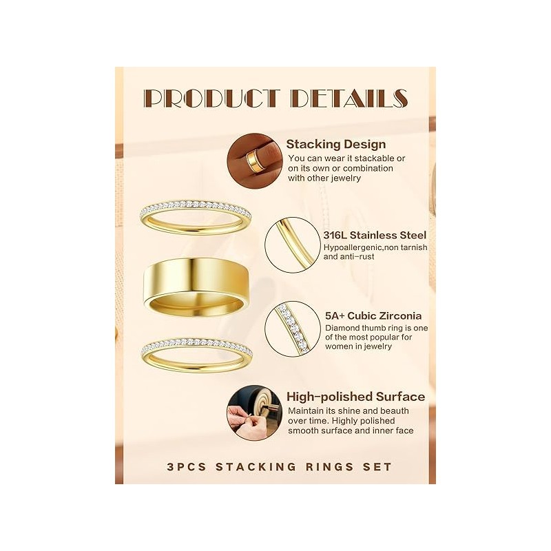 - STYLISH STACKING DESIGN This set of hypoallergenic gold plated or sterling silver contains three stackable rings: one simple ring and two diamond rings made of small cubic zirconia. Create endless combination possibilities by wearing the rings individually or stacked. The contrast between the eye-catching cubic zirconia statement ring and the simple, minimalist rings offers flexibility to express both subtle and eye-catching fashion sentiments.
