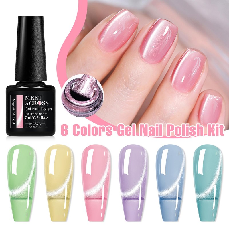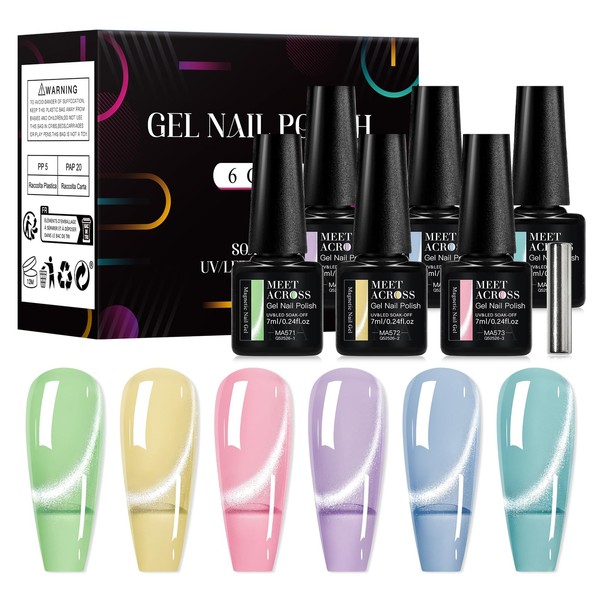MEET ACROSS Gel Nail Polish Set, 6 Colors Cat Eye Shimmer Collection, 7ml/0.24fl.oz Each, UV LED Soak Off (Set-2, 6pcs)