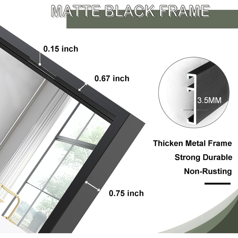 - BLACK FRAMED MIRROR: The large vanity mirror equipped with hanging hardware on the back. The wall mirror can be hung vertically or horizontally. Besides, the retangular mirror can be leaned to the wall as decoration.