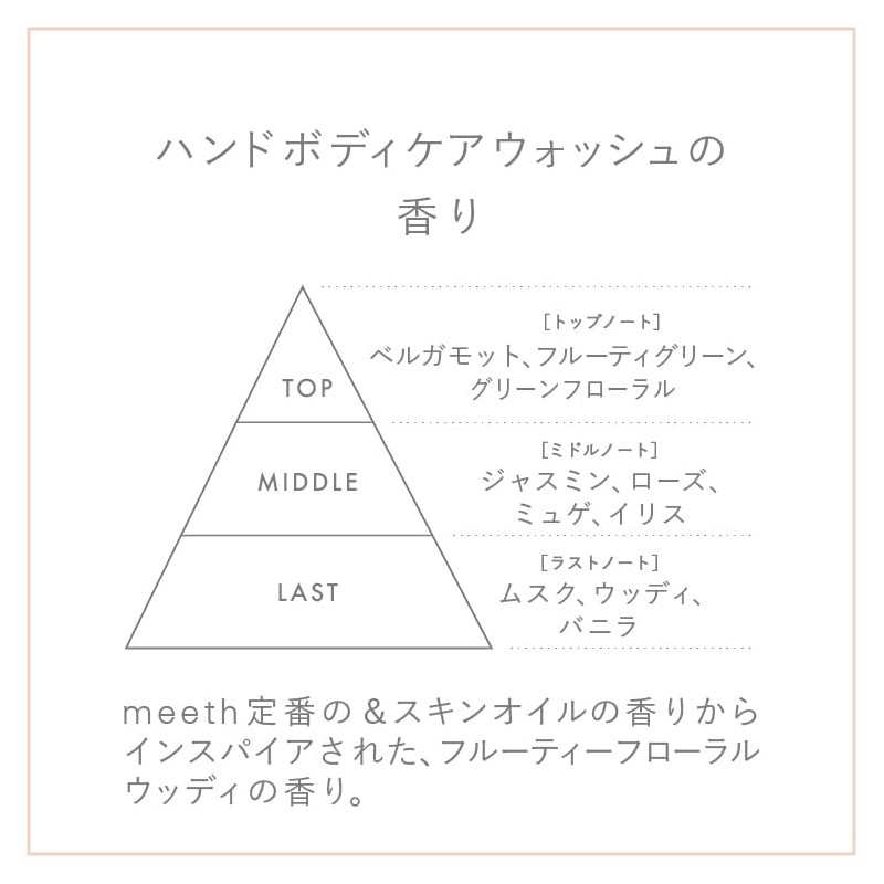 - Scent: The fruity floral woody scent is inspired by the classic scent of meeth's "& Skin Oil" for a luxurious feel