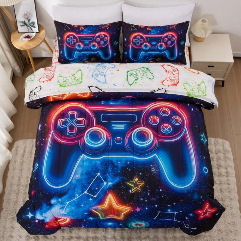 Meeting Story Gaming Bedding Set Full, 3D Game Controller Design Full Comforter, Space Comforter Set for Boys(Bluepurple)