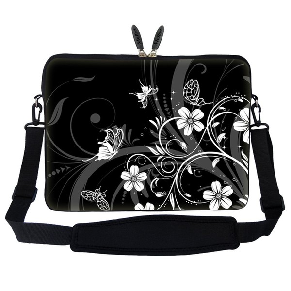 Meffort Inc 15 15.6 inch Neoprene Laptop Sleeve Bag Carrying Case with Hidden Handle and Adjustable Shoulder Strap - Black White Flower Butterfly