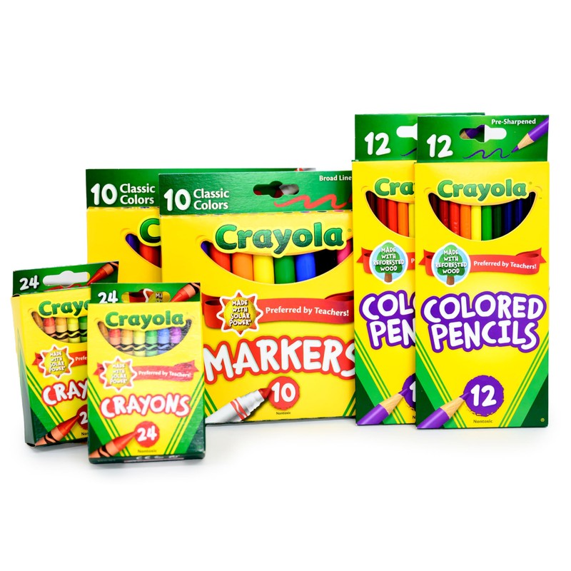 • Get creative and artistic with (2) 12" wooden rulers, (2) 12ct Crayola Colored Pencils, (2) 10ct Crayola Broadline Markers, (2) 24ct Crayola Crayons, (2) 3pk Creative Colors highlighters (yellow, pink, blue), (4) Elmer's Disappearing Purple Glue Sticks, and (2) Elmer's 4oz glue bottles.