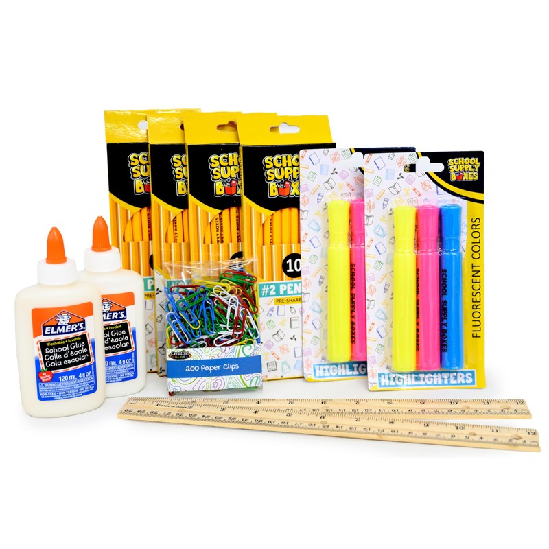 Back to school shopping for elementary school, middle school, and high school students was never this easy. This mega bundle contains (2) 1" binders, (4) 10pks of #2 pencils, (18) BIC ballpoint pens (6 black, 6 blue, & 6 red), (2) mini white boards, and (4) dry erase markers. Stay organized for all your classes with (10) 3 prong two pocket folders, (8) college ruled spiral notebooks, (4) college ruled composition books, (4) pks college ruled loose leaf paper, (2) 5 tab dividers, (2) binder pouches, (1) 80 ct coated paper clips, and (2) staplers. Get creative and artistic with (2) 12" wooden rulers, (2) 12ct Crayola Colored Pencils, (2) 10ct Crayola Broadline Markers, (2) 24ct Crayola Crayons, (2) 3pk Assorted Colors highlighters (yellow, pink, blue), (4) Elmer's Disappearing Purple Glue Sticks, and (2) Elmer's 4oz glue bottles. Be prepared for anything with (50) pencil cap erasers, (4) pink erasers, (2) 5" scissors, (8) pencil grips, (2) Sharpie Permanent Markers, (2) pencil sharpeners, (2) pocket calculators, and (2) locker buddies. Grab this mega box for a student as well as for an elementary school teacher, middle school, teacher, high school teacher, instructor, college student, or any educator who can always use more school or office supplies.