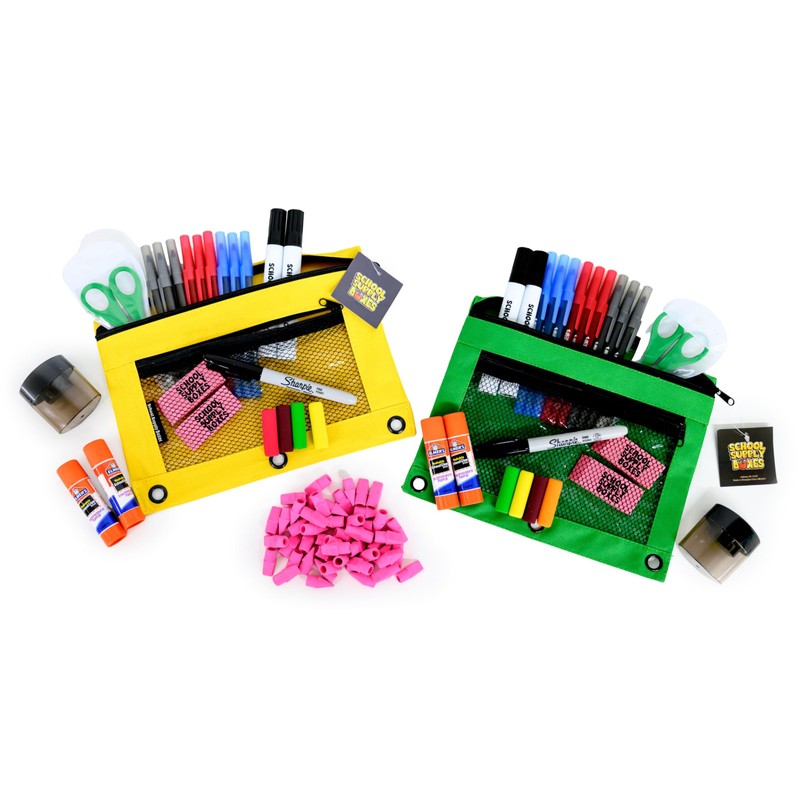 • Be prepared for anything with (50) pencil cap erasers, (4) pink erasers, (2) 5" scissors, (8) pencil grips, (2) Sharpie Permanent Markers, (2) pencil sharpeners, (2) pocket calculators, and (2) locker buddies.