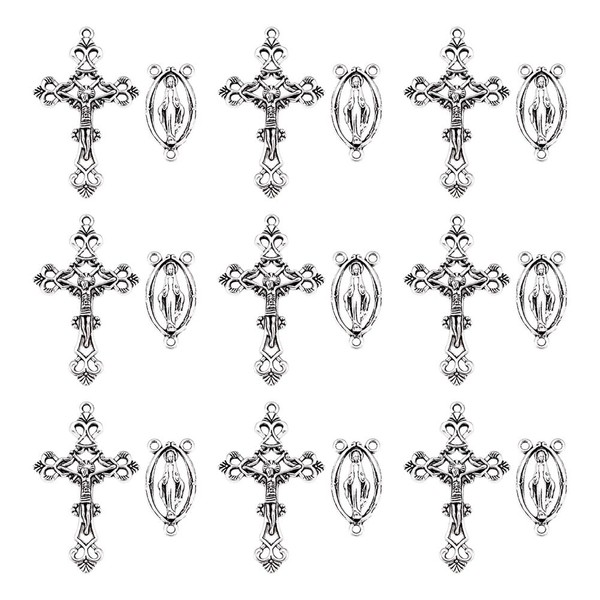 Mega Pet 10Sets Rosary Cross and Center Sets with Alloy Crucifix Cross Pendants and Oval Virgin Links for Rosary Bead Necklace Making Antique Silver Cross Charms