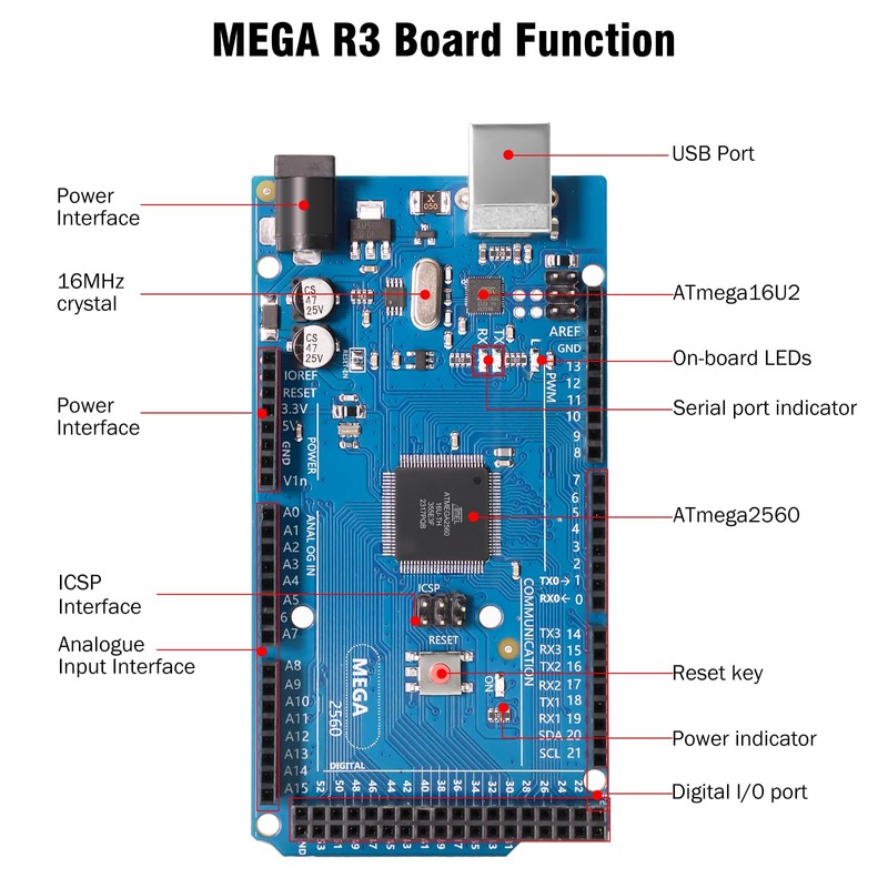 - Large storage capacity: MEGA R3 offers ample storage space for more programs and data with 256KB flash memory and 8KB SRAM, which increases development flexibility.
