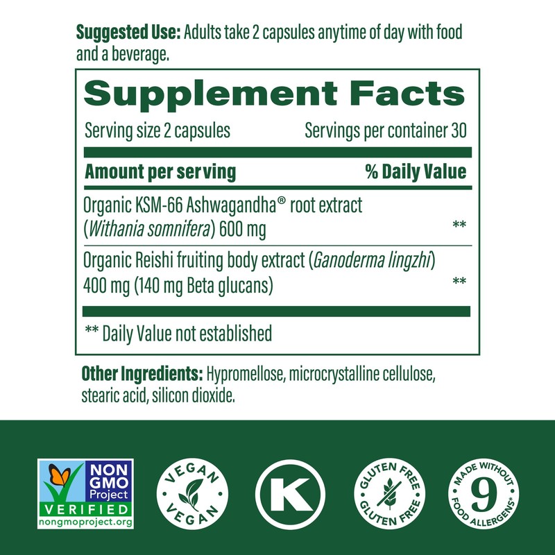 - PLANT-POWERED STRESS RELIEF+: Crafted with Reishi mushroom and KSM-66 Ashwagandha (1); Every serving guarantees 140 mg of beta glucans from 100% fruiting bodies; 600 mg of Ashwagandha per serving; No mycelium or grain fillers