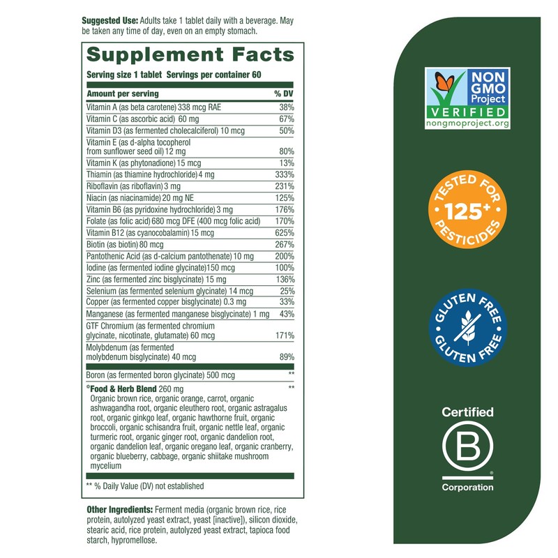 - Take Any Time Of Day: Take 1 tablet any time of day with a beverage, even on an empty stomach; Includes a Nourishing Food and Herb Blend plus added B vitamins for energy and nervous system health; Iron-free formula