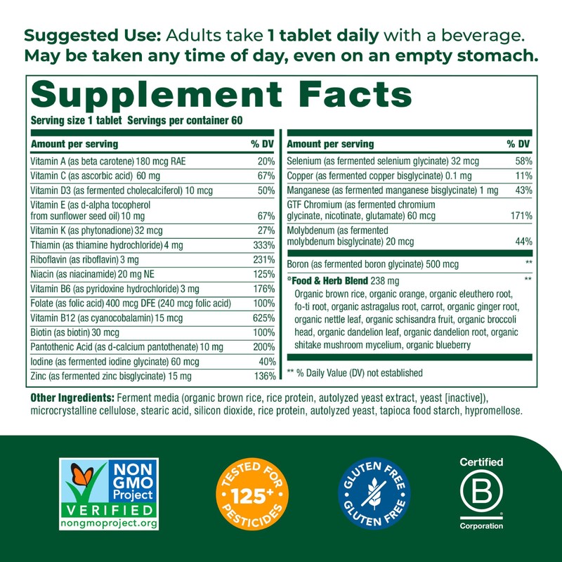 - All of our multivitamins are made with food-paired vitamins and fermented minerals, and can be taken any time of day, even on an empty stomach. 1 tablet daily