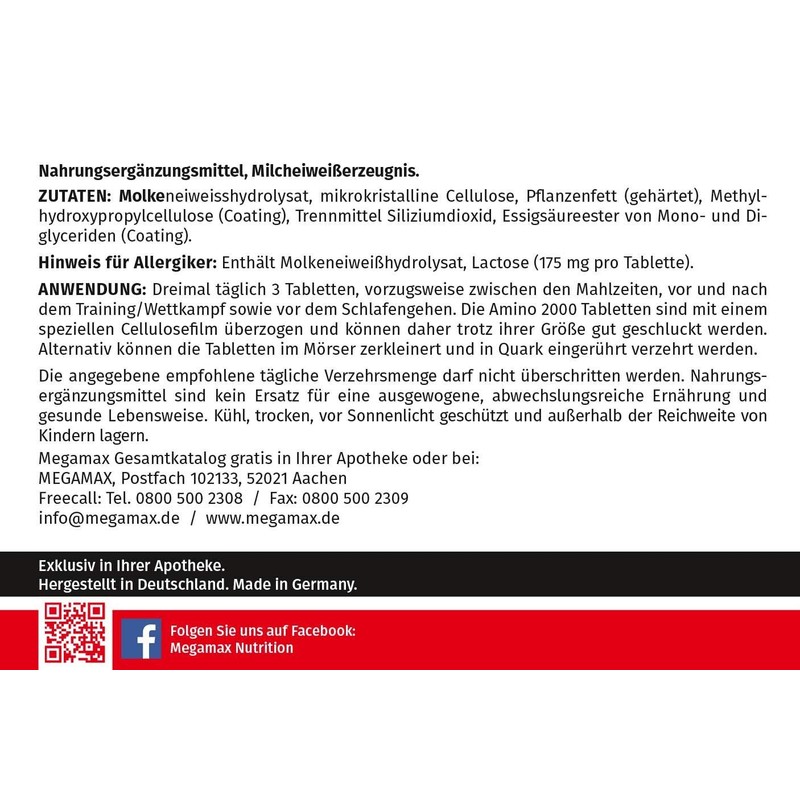 Megamax Amino 2000 Amino Acid Tablets, 100 Tablets, Pure Whey Protein Hydrolysate, Amino Acids Complex with (BCAA & EAA) and 7 Essential Aminos, Muscle Building, for Strength Sports and Bodybuilders