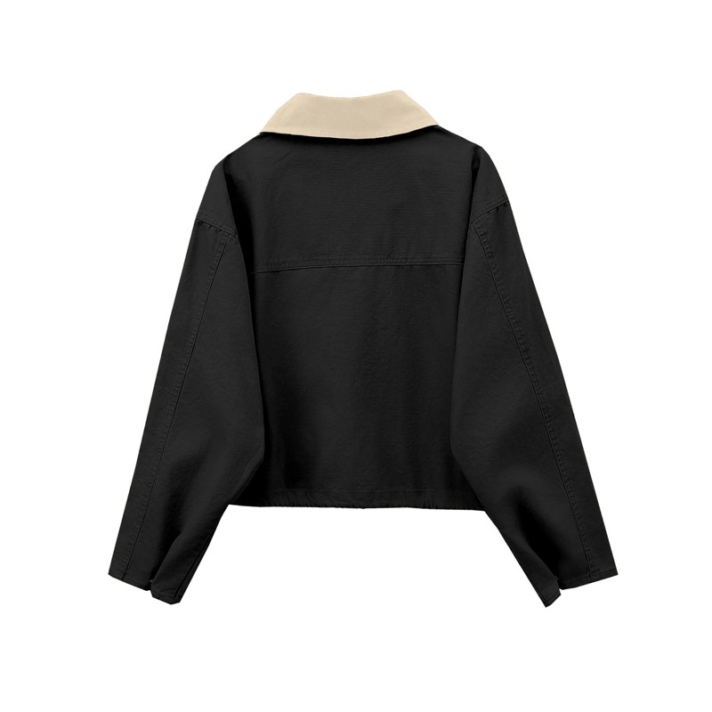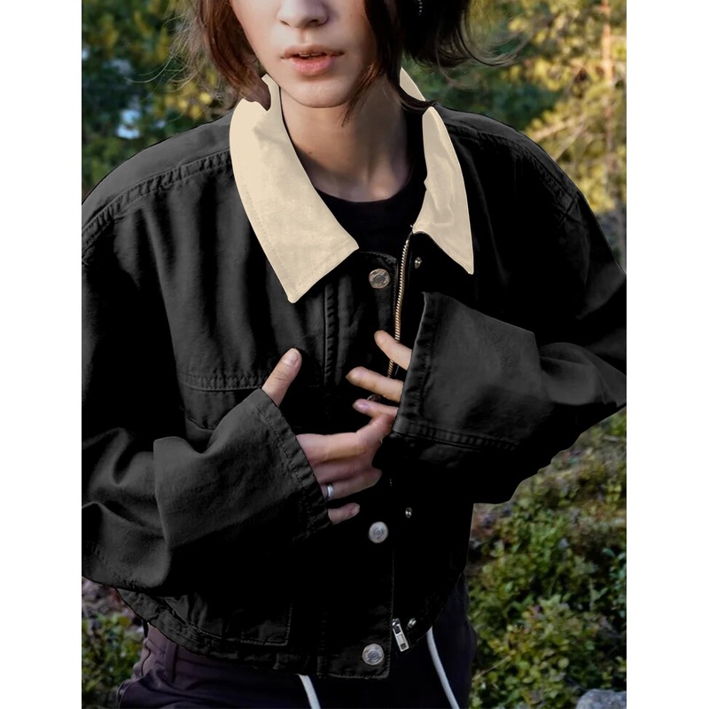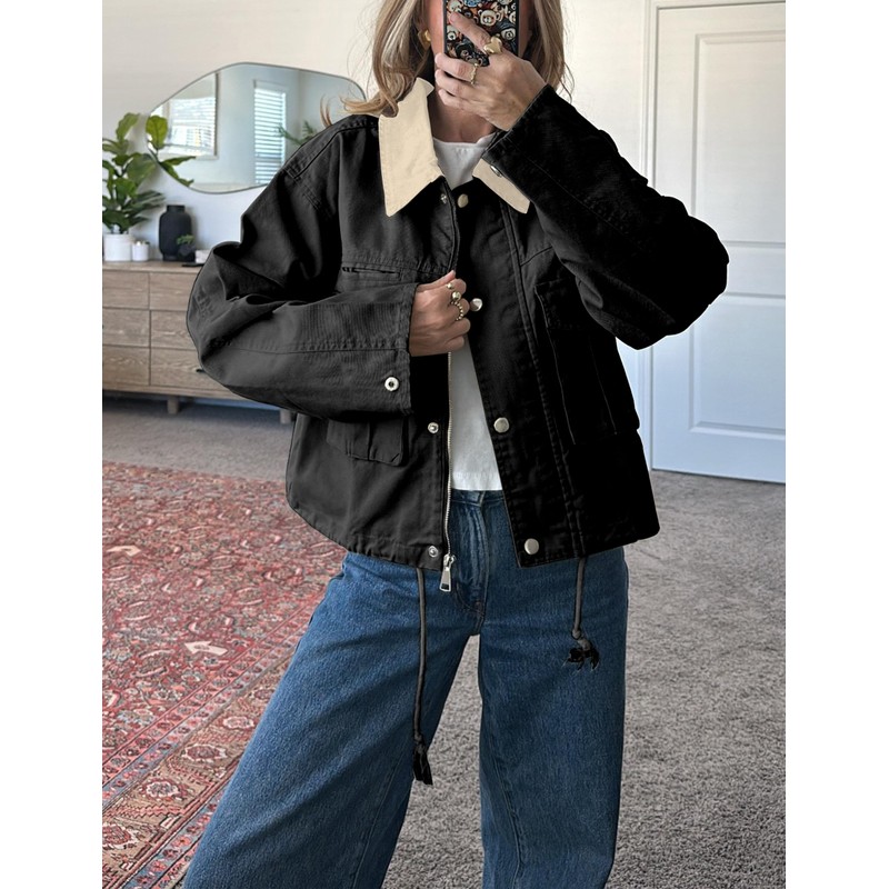 Megfie Womens Cropped Jacket Contrast Collar Utility Coat Cargo Jacket Barn Jacket Outwear with Pockets(0836-Black-M)