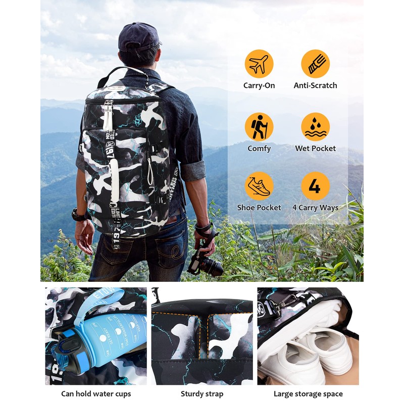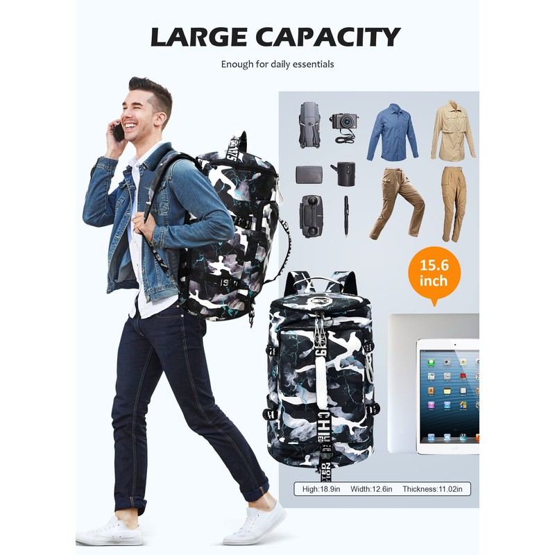 • 【Multi-function Design】:Besides being a men's camping backpack, it is also a Shoulder bag/Crossbody bag/Sports Duffel Bags/Handbag, you can convert it freely and easily to meet all of your needs . It has a long adjustable shoulder strap.Our sports gym bag is the perfect companion for indoor and outdoor sports.For exercise, travel, sports activities, tennis, basketball, yoga, fishing, hunting, camping, hiking and many outdoor activities. You can also use it like gym sports bag.