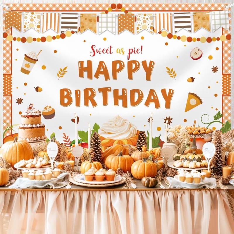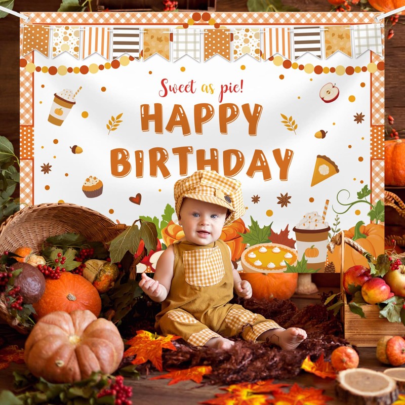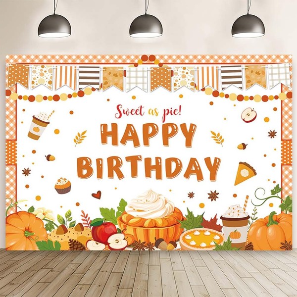 MEHOFOND 7x5ft Pumpkin Pie Birthday Backdrop Fall Orange Pumpkin Spice Latte Happy Birthday Banner Sweet as Pie Bday Background Autumn Bday Party Photo Booth Props