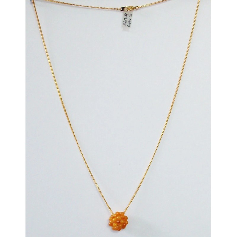 MEI Alaska's 3mm amber beads woven into a 1/2" ball floating on a 16" gold-filled display chain with a spring ring clasp.