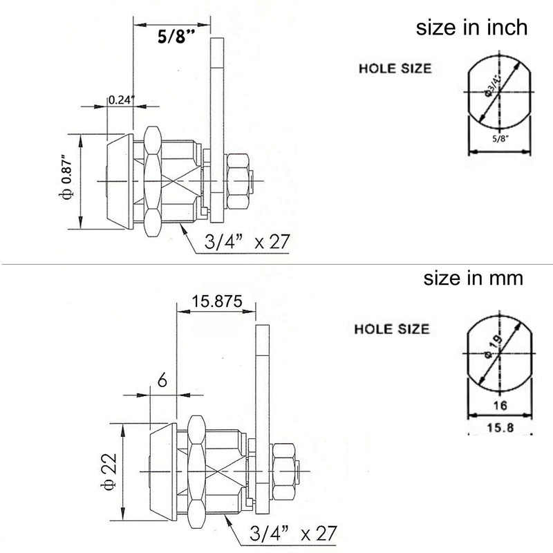 - 180 Degree rotation 2 key pull- key can be removed from both locked and unlocked positionCam Locks Body Length: 5/8"(17mm), Door Thickness ≤0.43"(11mm), Keyhole Diameter≈ 0.74" (19mm), please check detail on our figure drawing attached