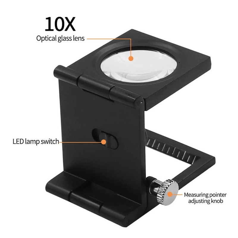 Meichoon Lupa plegable de 10 x microscopio de metal para computadora, plegable, lupa con luz LED, para lente óptica textil UC50