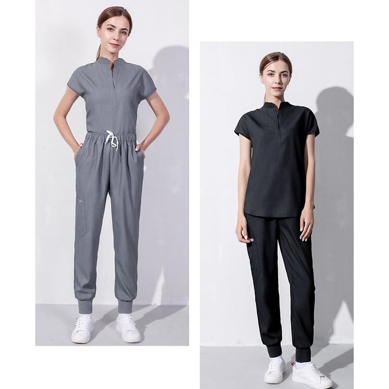 Meichoon Women's Medical and Nursing Scrubs Short Sleeve Set Stand Up Collar Stretch Top with 2 Side Pockets Tapered Drawstring Stretch Jogging Pants DK55Grey S