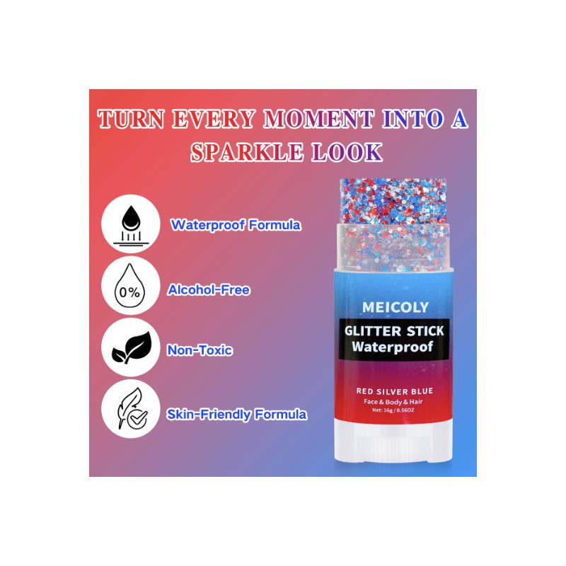 Easy to Use &Remove:The red white blue body glitter is easy to put on,only need to twist the applicator to get glitter.The applicator works well with pretty mess-free,it glides smoothly for precise,even coverage in seconds,making glitter application simple.Remove with ease when you're done,the glitter comes off easily with oil based makeup remover.