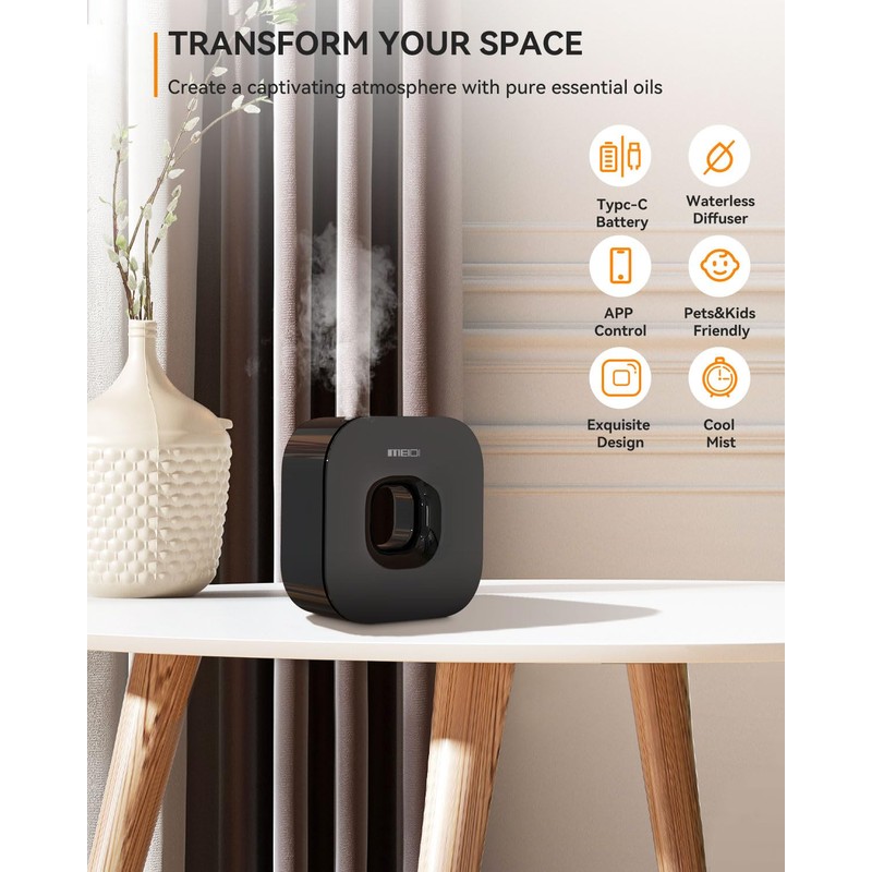 MEIDI Waterless Essential Oil Diffuser - Bluetooth Cordless Aromatherapy Diffuser with App Control, Smart Timer Setting, Hang-up Design and Wide Coverage for Home, Office, Hotel and SPA - Black