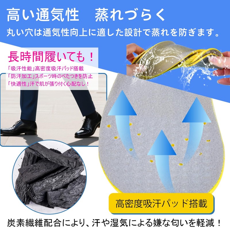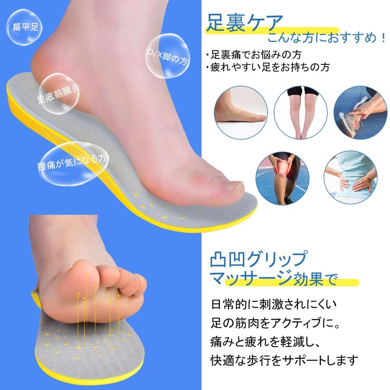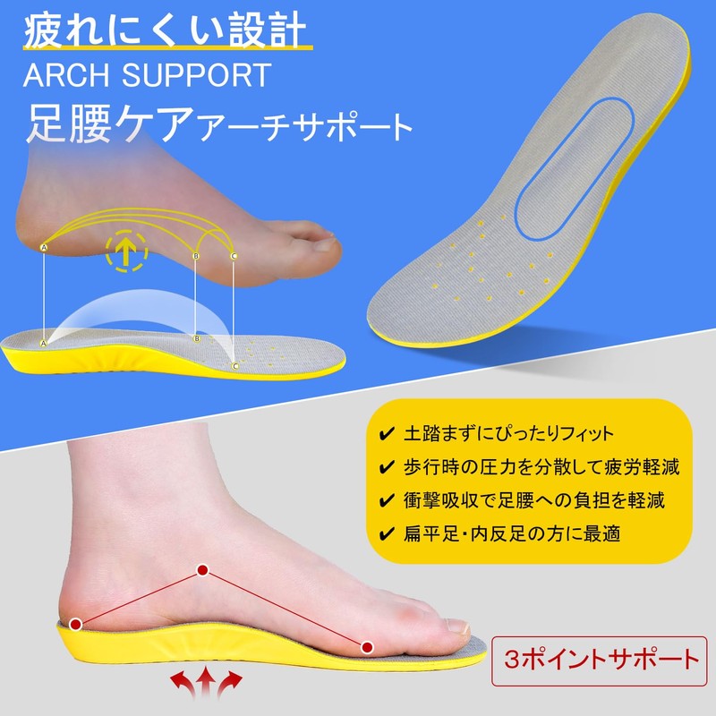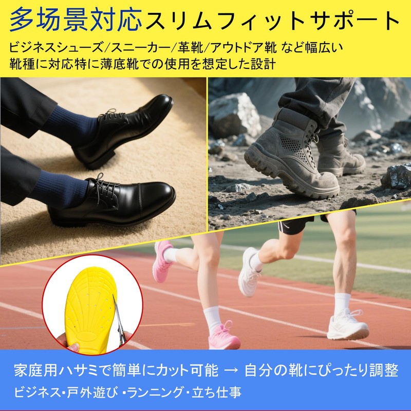 - 「サポート機能」: 土踏まずをしっかりと支え、足のアーチを適切な位置に保持することで、長時間の歩行や立ち仕事をサポート。 「使用シーン」 通勤、通学、スポーツなど、様々な用途に適した汎用性の高い中敷き。通勤や長時間の立ち仕事、ランニングなどのスポーツ、登山などのアウトドア活動に幅広く対応した設計です。