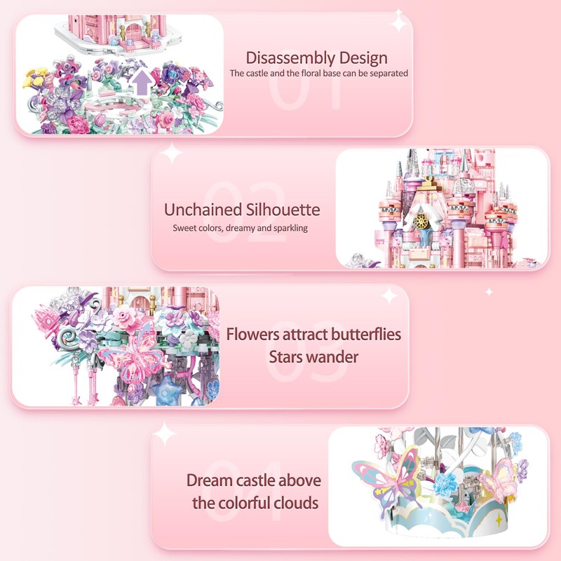 Disassembly Design:The castle and the floral base can be separated.Unchained Silhouette,Sweet colors, dreamy and sparkling.Flowers attract butterflies, Stars wander.Dream castle above the colorful clouds.