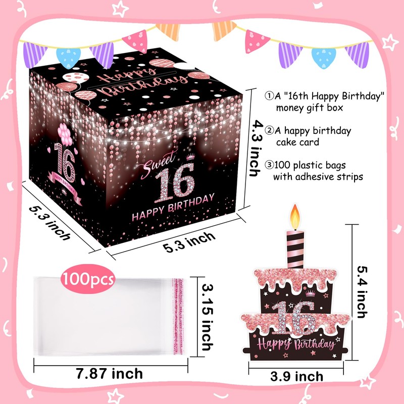- 【Package You Received】Including a beautiful "16th Happy Birthday" money box, a happy birthday cake card and 100 plastic bags with adhesive strips. You can DIY this money box and put any cash in it as a cash gift to your family and friends. Imagine the faces of your family and friends when they opened the money box. This will be an unforgettable moment.