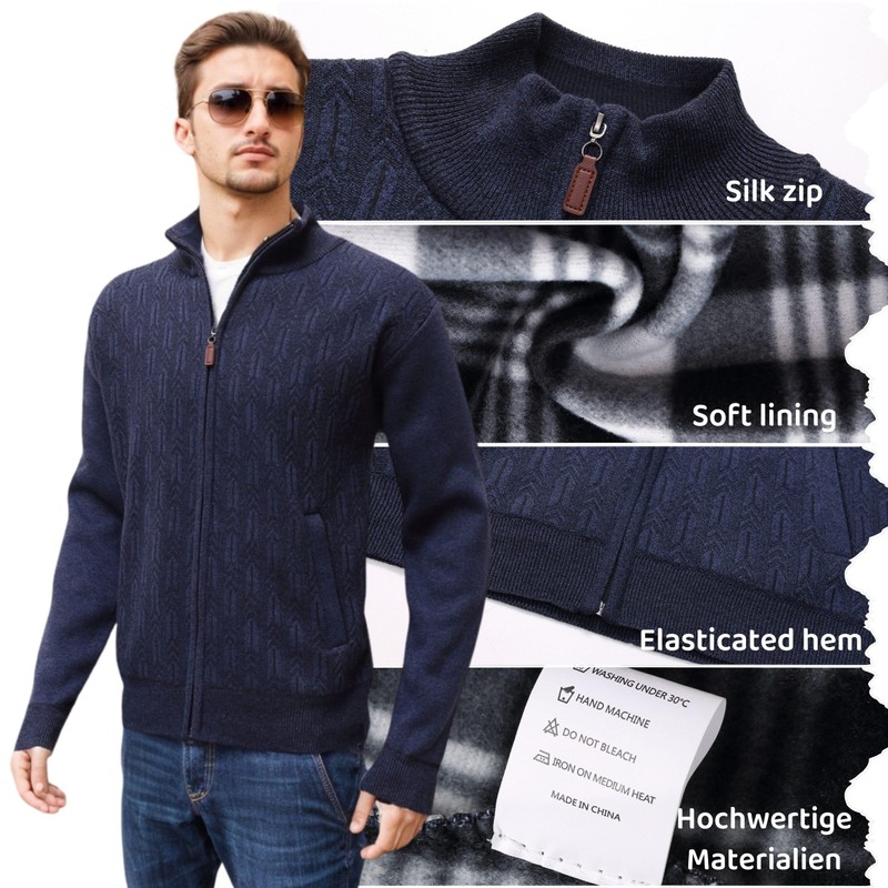 - Versatile transitional cardigan with long sleeves: This men's cardigan has a stylish stand-up collar and a practical zip. With 2 large pockets on the left and right side where you can store your phone and hands, you are dressed in style and comfort in any weather.