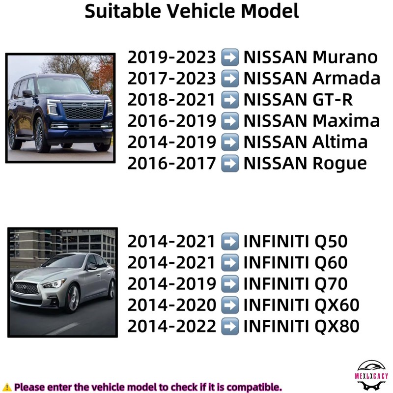 - 『Suitable Vehicle Model』: for NISSAN (2019-2023) Murano / (2017-2023) Armada / (2018-2021) GT-R / (2016-2019) Maxima / (2014-2019) Altima / (2016-2017) Rogue / for INFINITI (2014-2021) Q50 / (2014-2021) Q60 / (2014-2019) Q70 / (2014-2020) QX60 / (2014-2022) QX80.