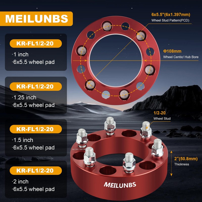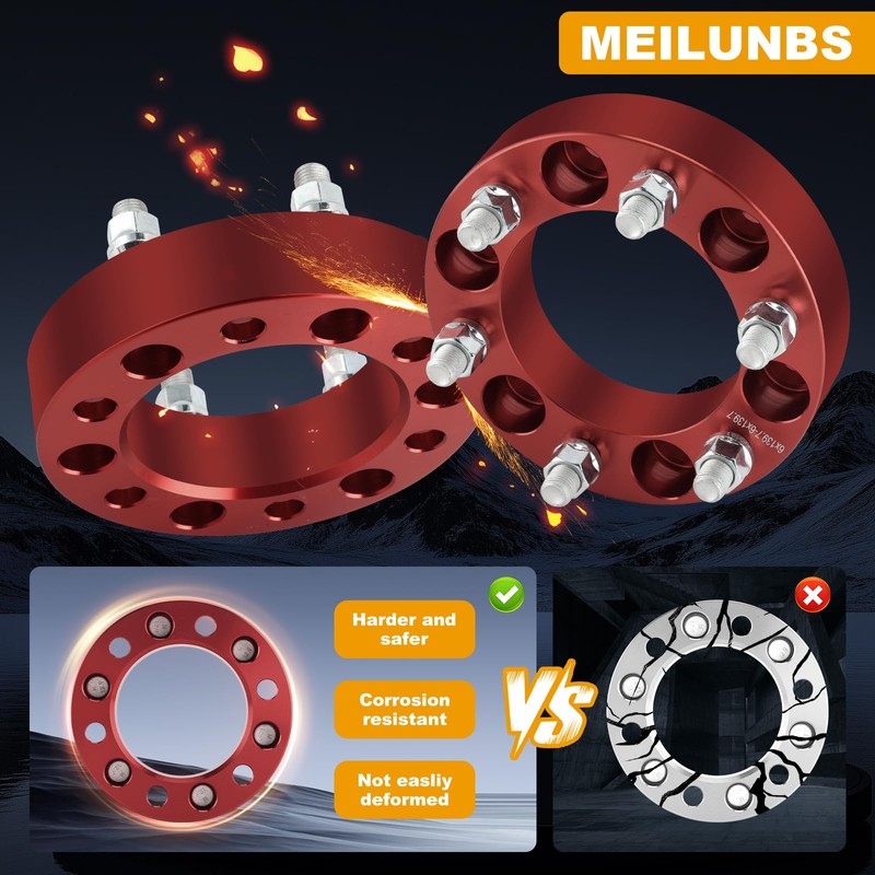 Premium Build for Long-lasting Durability MEILUNBS 6x139.7 wheel spacers are made from genuine forged 6061-T6 anodized aluminum, renowned for its exceptional strength and lightweight properties. This high-quality material ensures maximum durability and resistance to corrosion, even in the harshest conditions. CNC precision machining guarantees an exact fit, providing a smooth, vibration-free driving experience. The inclusion of heat-treated 10.9 grade Geomet-coated bolts further enhances their longevity by resisting stripping or breaking. Improved Fitment and Stability Designed with a 106mm hub-centric structure, these spacers ensure a tight, secure fit, minimizing vibration and enhancing overall vehicle stability. Precisely measured to match OEM hub and bore dimensions, MEILUNBS spacers are ideal for a variety of vehicles, providing reliable performance on both off-road trails and highways. Enhanced Aesthetic Appeal and Performance The 32mm thickness of MEILUNBS wheel spacers pushes your wheels outward, resolving clearance issues with brake calipers or shocks. This not only improves your vehicle's visual stance, giving it a more aggressive, sporty look but also optimizes wheel alignment for superior driving performance, especially in demanding conditions. Technical Specifications Thickness: 1/1.25/1.5/2" Bolt Pattern: 6x5.5” (6x139.7mm) Center Bore: 106mm with lip Thread Pitch: 12x1.5mm/14x1.5mm/1/2x20‘’ Recommended Torque: 72-80 FT/LBS Each spacer is laser-etched with sizing and part number information for easy identification and installation. Note: Not compatible with front wheels featuring locking hubs (e.g., some years of Land Cruiser and Pickup models)